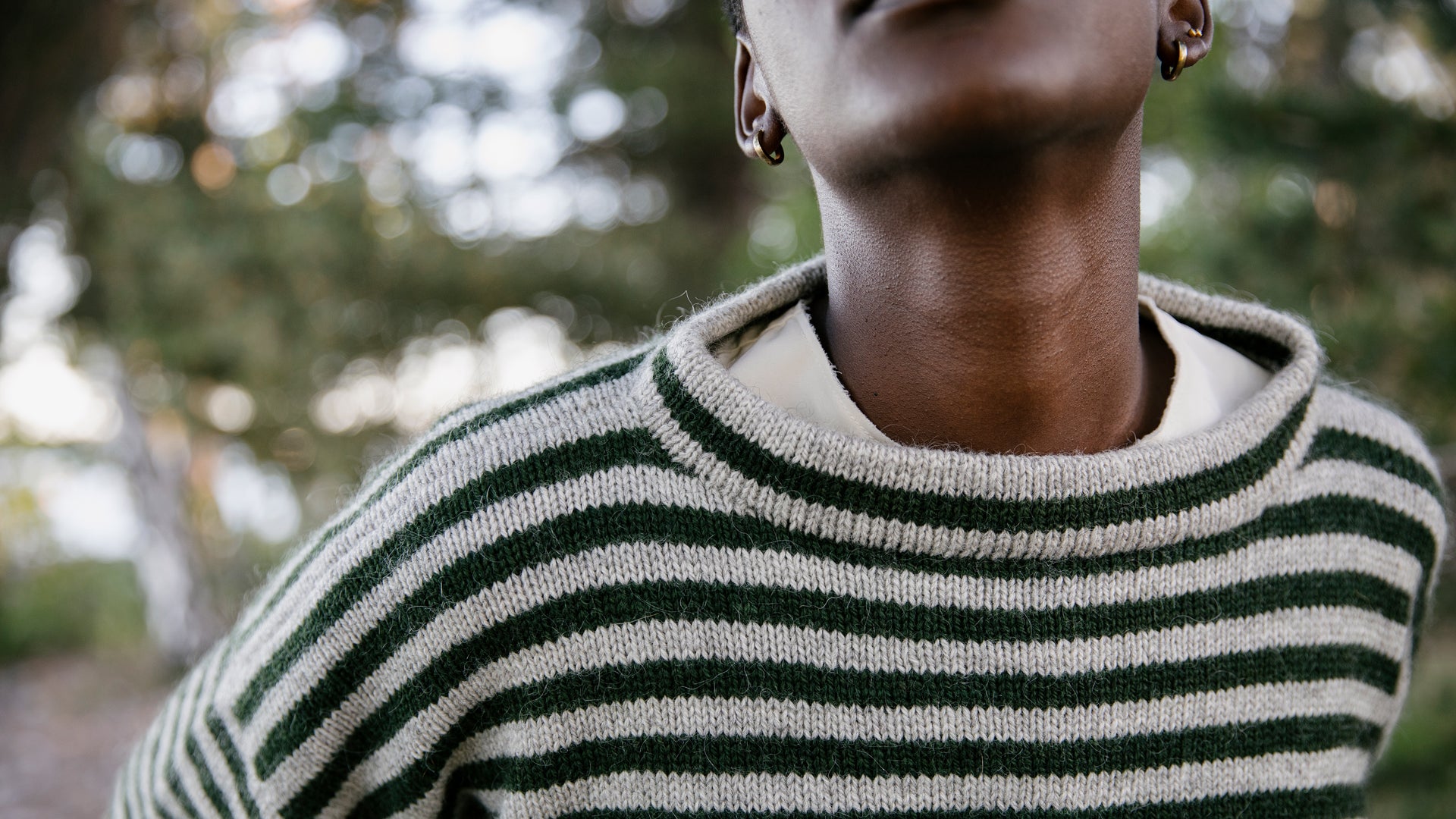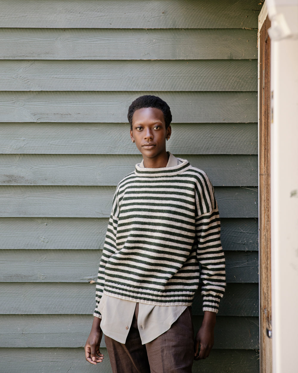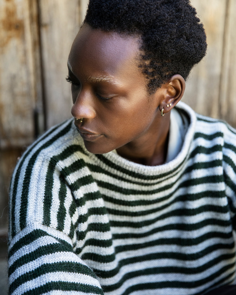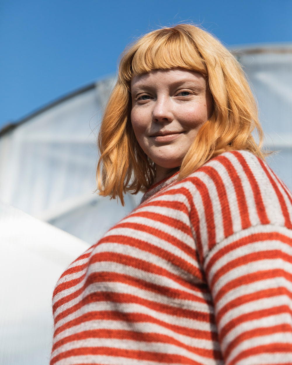 Even though it is a simple, uncomplicated sweater, there are a couple of tricks to learn: the stripes are jogless and the colour switches in the ribbing invisible.