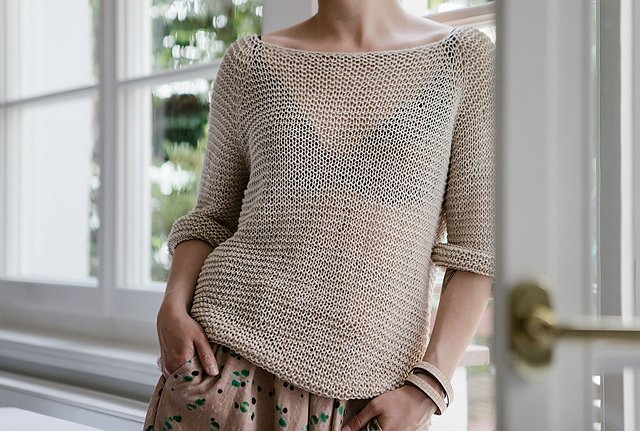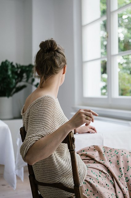 Selja has an identical front and back, so you can wear it whichever way you want. It is a quick and uncomplicated knit – easy enough for beginners and enjoyable for more experienced knitters. The stretchy garter stitch sweater is pinned to measurements at the end, so don’t be alarmed even if it seems too short right off the needles.