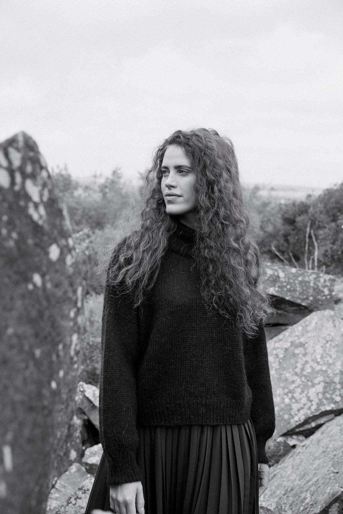 Worked seamlessly from the top down, Stormfell features a relaxed drop-shoulder silhouette and a sculptural turtleneck – simple, but striking. Knitted in Laine x Novita DK and Novita Edith Silk Mohair. I chose a dark blue that reminds me of home: a town tucked between two lakes, where the sky and water often blur into one.