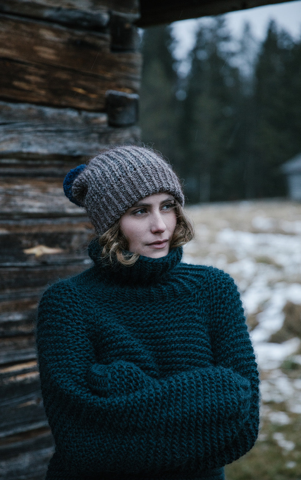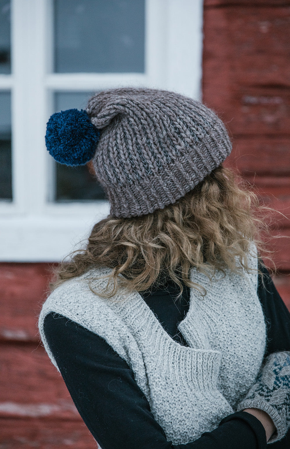 Inspired by Jonna’s love for pines, Kotte (a Swedish word for ’cone’) is a perfect, quick project for anyone trying brioche for the first time. The hat is knitted with large needles and combines a super bulky, woolly yarn with divine silk mohair. Optionally, you can finish the hat with a large pompom with yarn you have found from your stash.