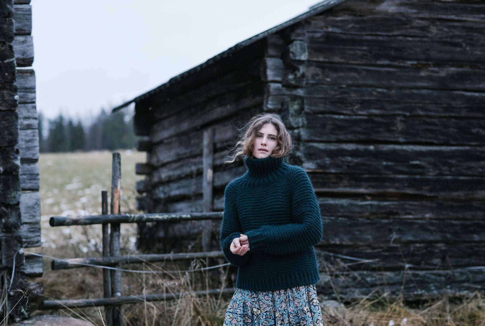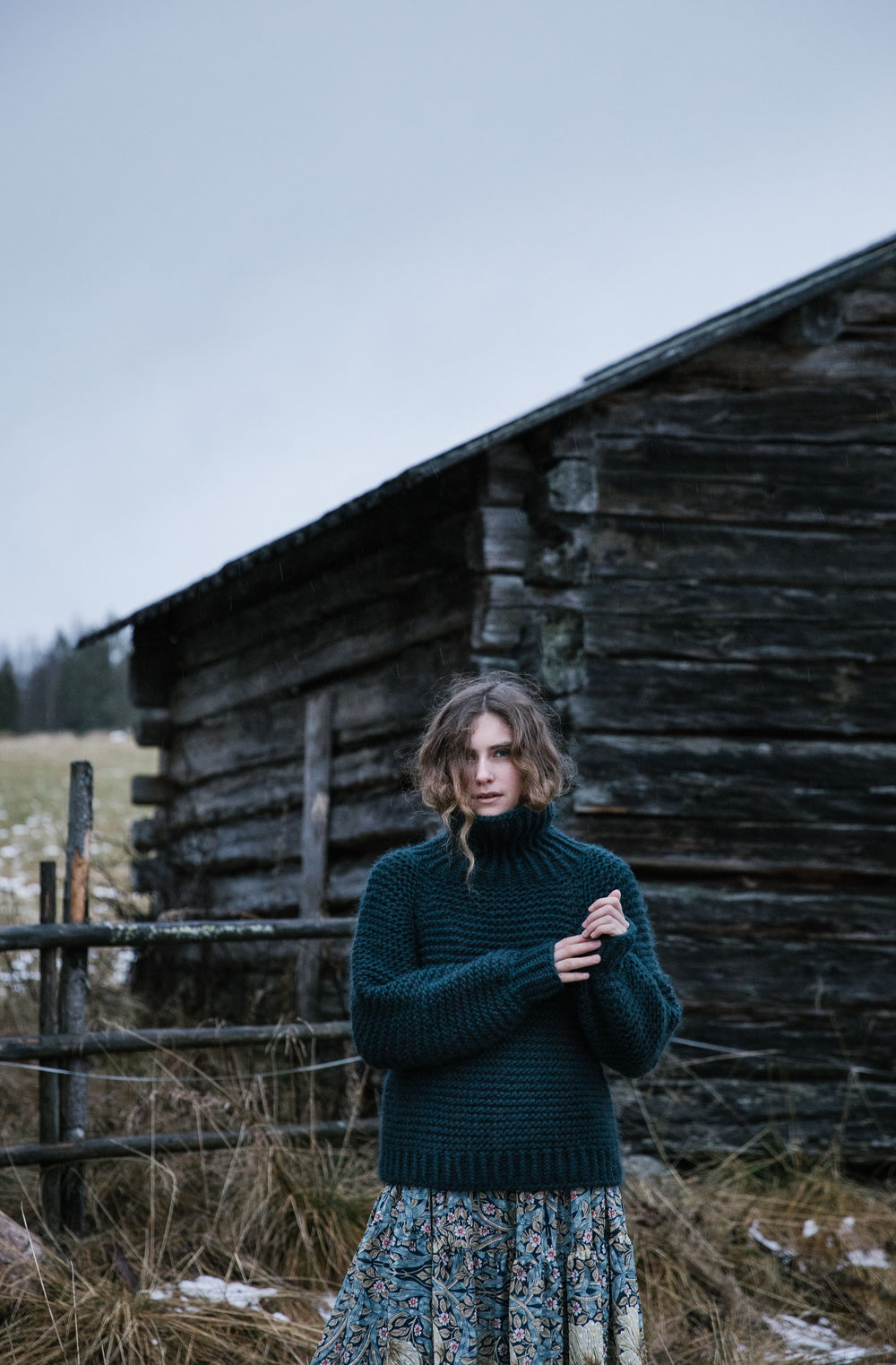 Meri is a super cosy and warm pullover featuring a high funnel neck. It is worked top down as one piece. It is knitted in garter stitch, which means that every other round is a knit round and every other round is a purl round. Meri is a quick and uncomplicated knit – easy enough for beginners and rewarding for more experienced knitters. In the end, the stretchy garter stitch pullover is pinned to measurements, so do not be alarmed, even if it seems too short right off the needles.